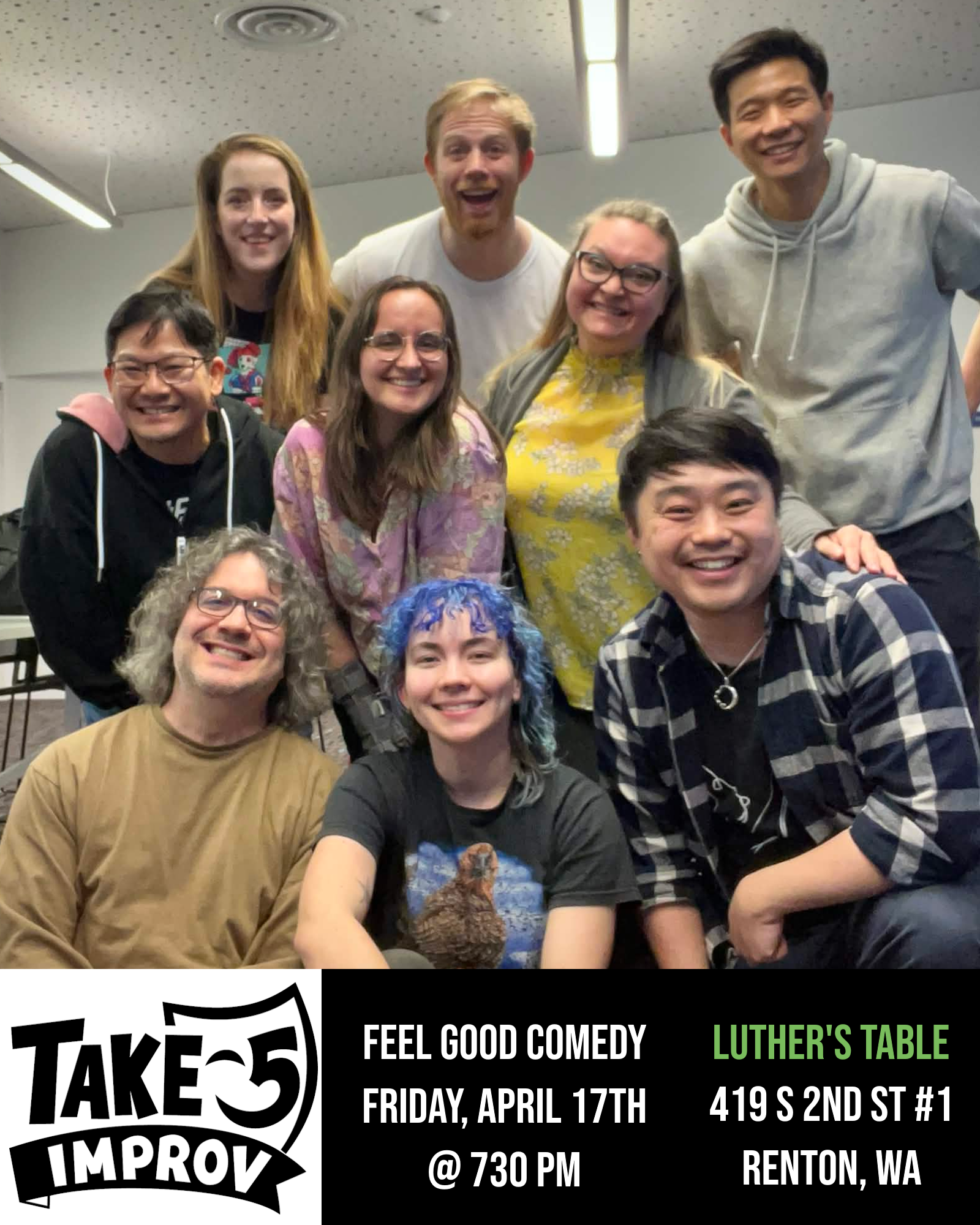 Take 5 Improv is back at Luther’s Table at 7:30pm on Friday, April 17th! We’re thrilled to be performing Director’s Cut, our flagship show, and to welcome the Mayor of Renton as a guest in the audience!